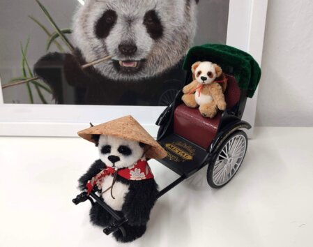 10 cm, schwarzer und weißer Alpaka, schwarze Pfoten aus Wildleder, schwarze Glasaugen, 5-fach gegliedert, Magnete in den Armen, mit Baumwolle und Stahlgranulat gefüllt.
