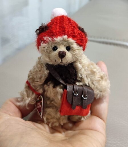 9 cm, hellbrauner und dunkelbraun gelockter Plüsch, hellbraune Pfoten aus Wildleder, schwarze Glasaugen, braune Nasenbestickung, 5-fach gegliedert, Magnete in den Armen, mit Baumwolle und Stahlgranulat gefüllt. Tasche aus Leder genäht und Herz mit Aufschrift "Mein Bärchen". Curly trägt eine gestrickte Mütze.