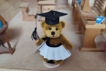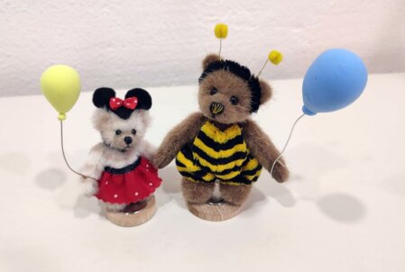 8 cm, brauner Long Pile, braune Pfoten aus Wildleder, schwarz-gelbe Nasenbestickung, schwarze Glasaugen, 5-fach gegliedert, Magnete in den Armen, mit Baumwolle und Stahlgranulat gefüllt. Bienenoutfit.