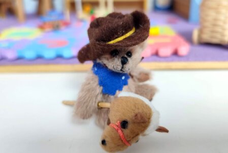 4,5 cm, brauner Long Pile, braune Pfoten aus Wildleder, schwarze Glasaugen, schwarze Nasenbestickung, 5-fach gegliedert, Magnete in den Armen, mit Baumwolle und Stahlgranulat gefüllt. Trägt einen Cowboyhut aus Filz.