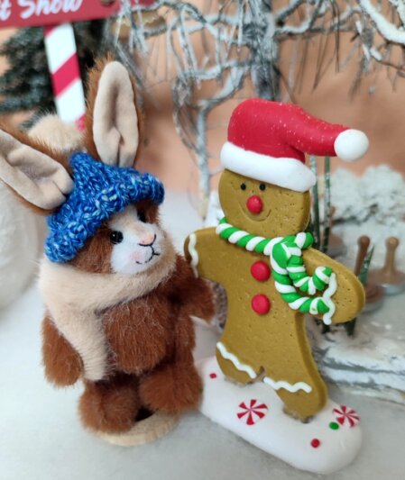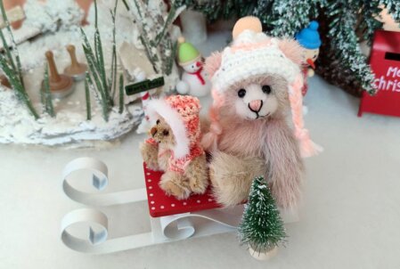 4,5 cm, beiger Stoppelmohair, braune Wildlederimitatpfoten, braune Glasaugen, braune Nasenbestickung, 5-fach gegliedert, Magnete in den Armen, mit Baumwolle und Stahlgranulat gefüllt.Trägt gehäkelte Kapuzenmütze.