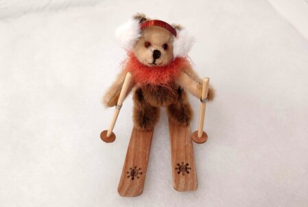 8 cm, hellbrauner und dunkelbrauner Long Pile, hellbraune und dunkelbraune Pfoten aus Wildleder, braune Glasaugen, braune Nasenbestickung, 5-fach gegliedert, Magnete in den Armen, mit Baumwolle und Stahlgranulat gefüllt. Trägt Ohrenschützer und gehäkelten Schal. Bringt selbstgemachte Ski mit Gravur mit.